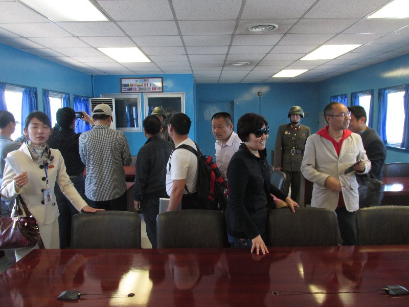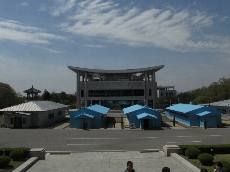 とうとう来た板門店。この青色の建物郡を横切る見えない線が軍事国境線。