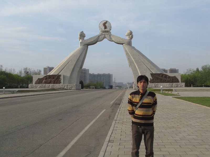 車で平壌へ戻る。その途中にある祖国統一3大憲章記念塔で記念撮影。