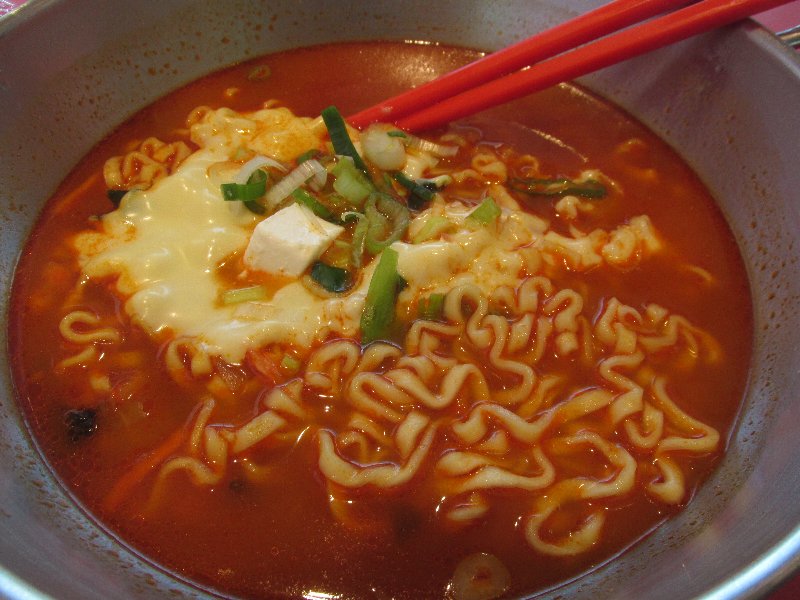 5時間くらいの待ち時間があるソウルの空港ではチーズ入りキムチ辛ラーメンを。これがうまかった。