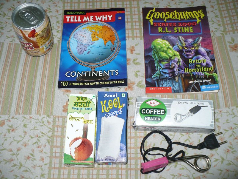 ひまつぶしの本やコイルヒータを買う。コイルヒータはたった35ルピー(約72円)。水さえあれば宿の部屋でカップ麺を食べたり暖かいものを飲めるので便利。