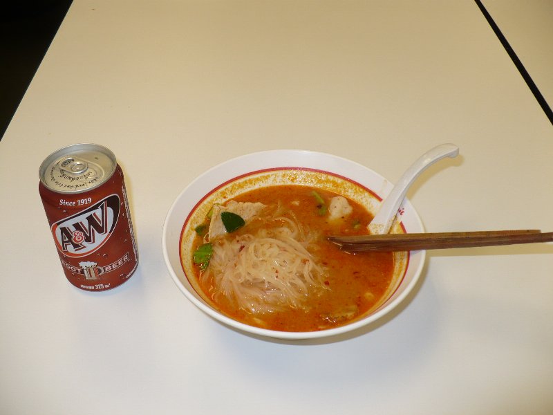 空港のフードコートでトムヤムスープの麺を。味はまずまず。