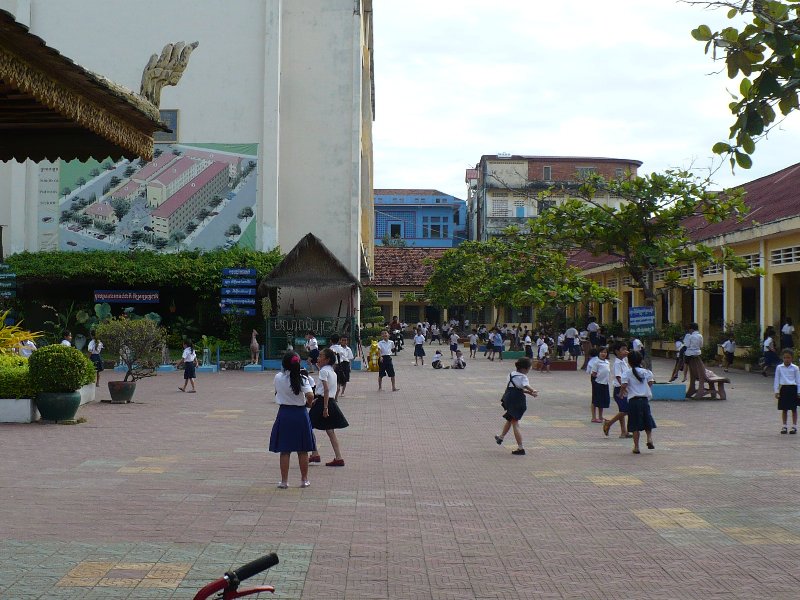 朝は歩いてセントラルマーケットへ行く途中に学校が。カンボジアの子供たちが中庭で遊んでいます。
